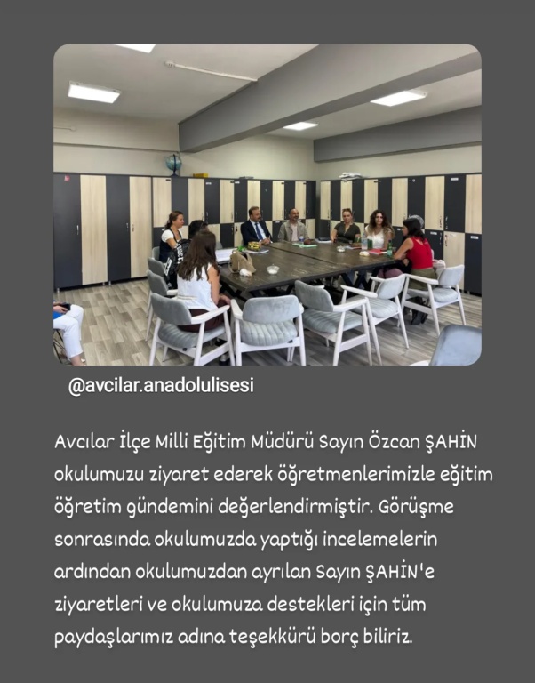 İlçe Milli Eğitim Müdürü Sayın Özcan ŞAHİN, bugün okulumuzu ziyaret ederek, öğretmenlerimizle eğitim öğretim gündemini değerlendirmiştir. Sayın Özcan ŞAHİN'e ziyaretleri ve okulumuza destekleri için tüm paydaşlarımız adına teşekkür ederiz.
