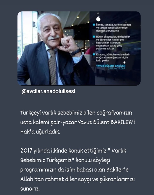 Türk Edebiyatının Müstesna Kalemlerinden Yavuz Bülent BAKİLER’in Vefatını Derin bir üzüntüyle öğrenmiş bulunmaktayız.